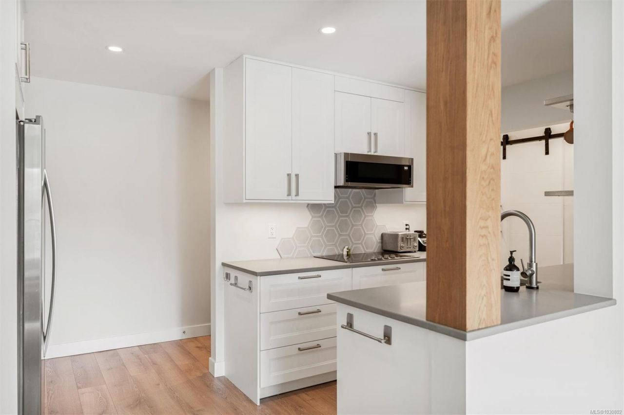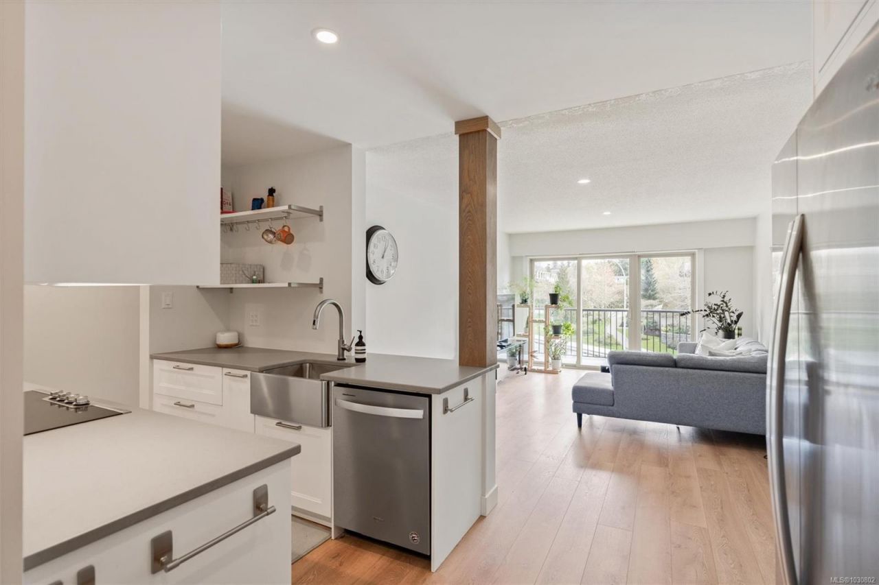Top floor, beautifully renovated condo near the University! Gorgeous updates throughout including like new laminate floors, kitchen cabinetry, tile backsplash, whirlpool stainless steel appliances and a Frigidaire induction stove. Updated 4 piece bathroom features a tile tub with a rainfall shower-head. In unit washing machine. Modern and neutral finishings with chic barn doors elevate this 1-bed 1-bath unit. Spacious sun drenched private deck off the bright living room with views of Mount Tolmie. The building includes excellent amenities such as a swimming pool, sauna, billiards room, workshop, library and more. Additional storage, 1 parking...read more